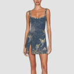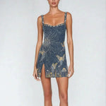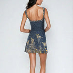 - Design: Rochie mini mulată cu imprimeu cosmic și accente aurii