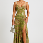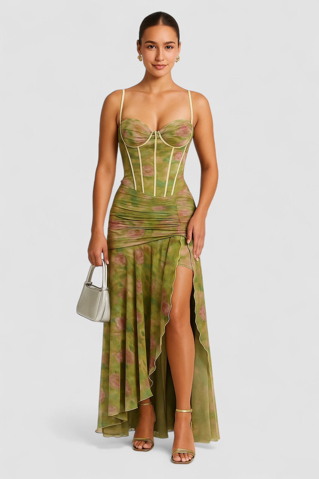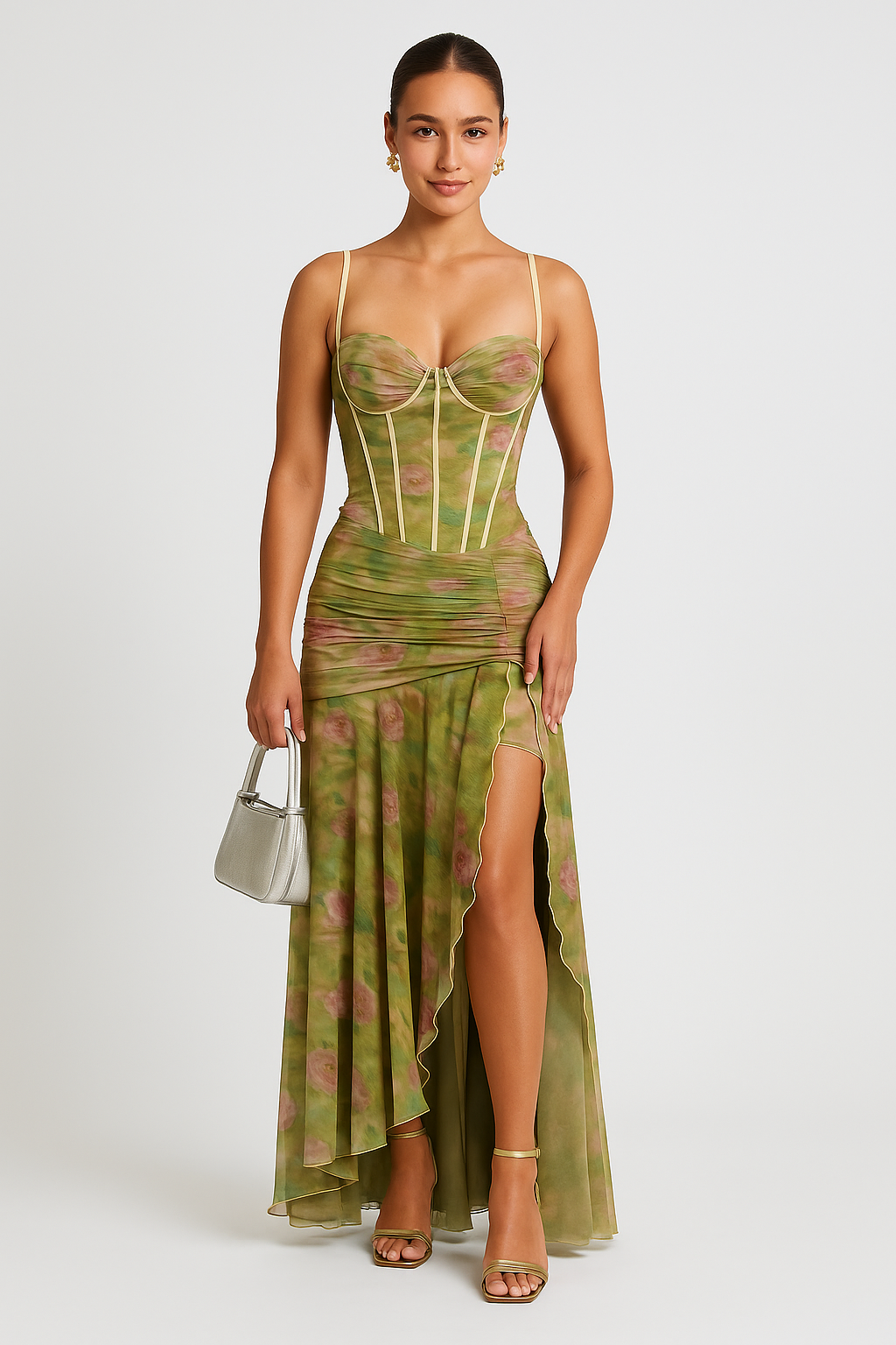 Îmbrăcați-vă în Cireya – rochia maxi cu model floral și bucurați-vă de romantismul unei grădini înflorite. Modelul delicat cu flori și corsetul care evidențiază talia creează o siluetă elegantă, perfectă pentru evenimente speciale, petreceri în aer liber sau cine elegante.