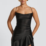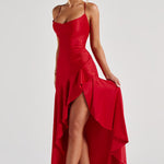 Rochia maxi Seraphine în roșu este alegerea ideală pentru a atrage toate privirile. Tivul dramatic High-Low, fusta pliată și fanta elegantă pe coapsă combină rafinamentul cu un aer încrezător – potrivită pentru seri romantice, evenimente formale sau petreceri elegante.