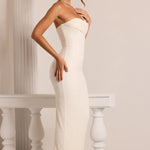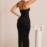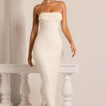 • Design: Rochie maxi fără bretele cu decolteu cowl și formă ajustată