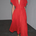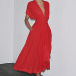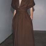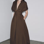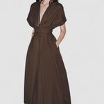 - Detalii: Decupaj adânc în V, buzunare laterale, brâu ajustabil