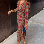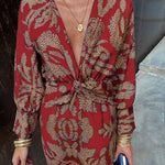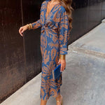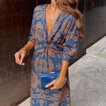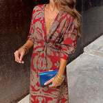 Rochia Frieda™ | Rochie midi cu model baroc aduce un stil luxos în garderoba ta. Datorită imprimării baroce opulente și decolteului seducător în formă de V cu detaliu de nod, această rochie reprezintă o estetică încrezătoare și elegantă. Silueta fluidă subliniază subtil figura, făcând rochia un tovarăș ideal pentru ocazii speciale sau seri de vară stilate.