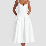 - Detalii: Top ajustat, fustă evazată, bretele ajustabile, buzunare practice