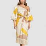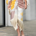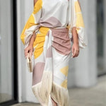 • Caracteristici speciale: Franjuri la margine, design asimetric pe un umăr și model artistic elegant.