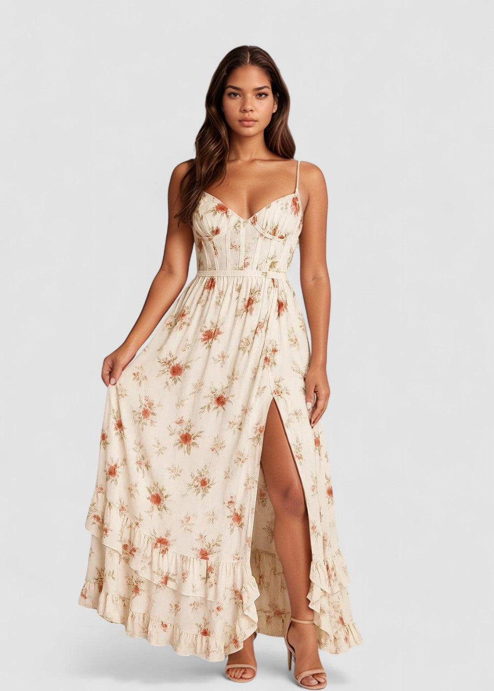 Rochia maxi Yana cu volane și imprimeu floral aduce un echilibru rafinat între eleganță clasică și stil modern. Croiala fluidă, decolteul în formă de inimă și imprimeul floral delicat oferă un aer feminin și sofisticat, potrivit pentru evenimente elegante, petreceri în aer liber, vacanțe sau seri speciale.