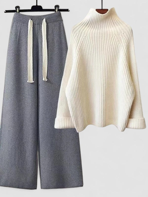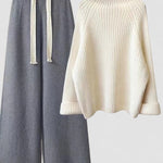 • Stil fără efort: Puloverul clasic cu gât înalt și pantalonii cu picioare largi creează o ținută elegantă, dar confortabilă pentru orice ocazie.