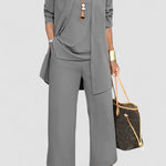 Design Rafinată în Trei Piese – Include o jachetă, un top și pantaloni asortați pentru un aspect coordonat și stilat.