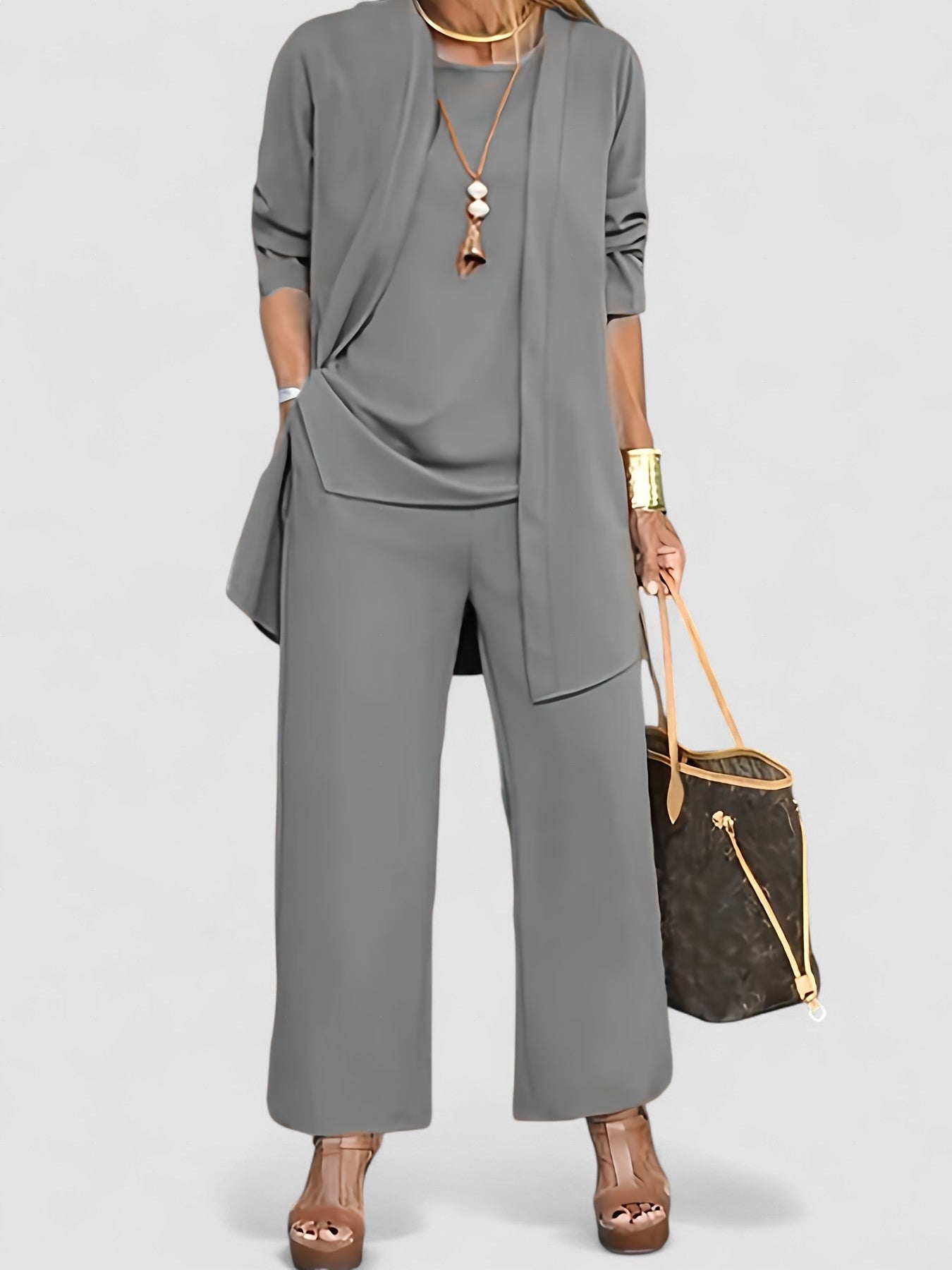 Setul Melissa Eleganță Modernă în trei piese combină sofisticarea cu confortul pe tot parcursul zilei. Având o jachetă fluidă cu deschidere în față, un top cu croială lejeră și pantaloni cu picioare largi, acest set oferă un aspect rafinat fără a sacrifica ușurința. Perfect pentru zilele de lucru, evenimente sau întâlniri de weekend, este ținuta ta preferată pentru un stil instantaneu rafinat.