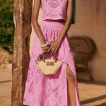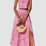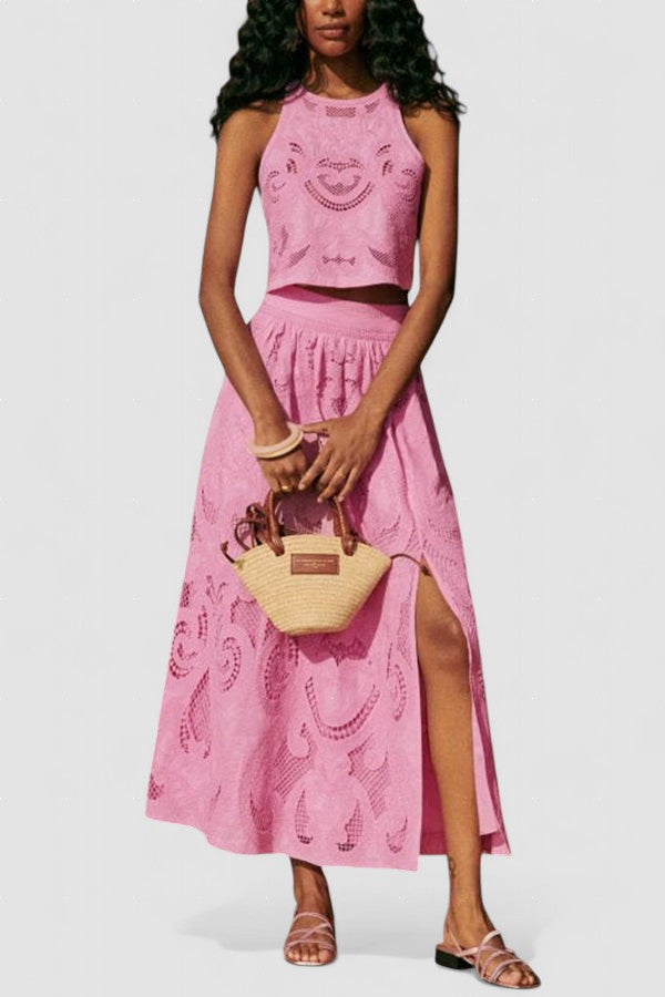 Capturați spiritul verii cu Setul Dantelă Roz Moise — un ansamblu frumos conceput din două piese care îmbină farmecul boho cu stilul atemporal. Cu un top din dantelă scurt și o fustă cu talie înaltă și o fanta laterală subtilă, acest set aduce ușurință, mișcare și grație feminină în garderoba dumneavoastră. Ideal pentru escapade însorite, brunch-uri în grădină sau orice ocazie care necesită o notă delicată și romantică.