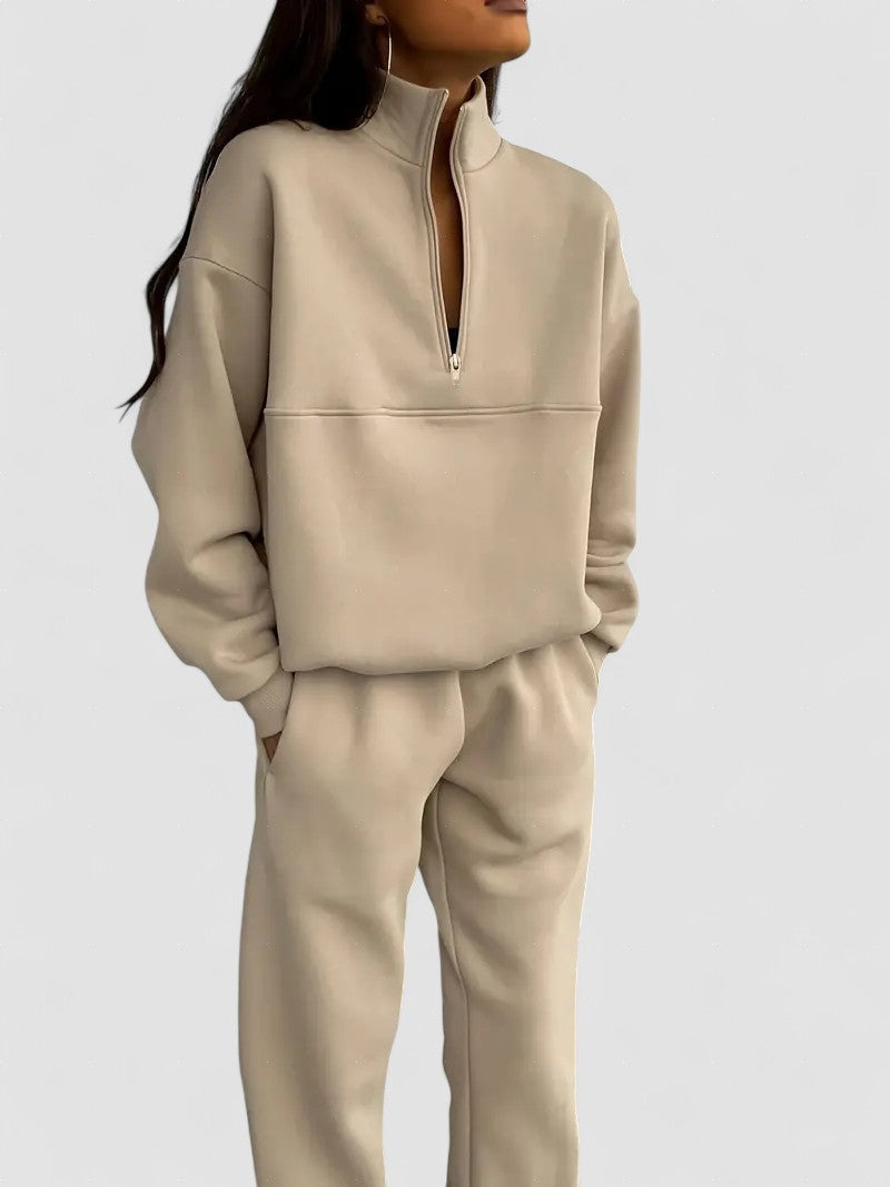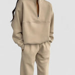 Design: Acest set include o jachetă cu guler și închidere cu fermoar, asociată cu pantaloni asortați, oferind un aspect coerent și stilat.