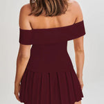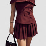 Design: Un set statement format din două piese, având un blazer structurat off-shoulder cu o croială ajustată, combinat cu o fustă plisată fluidă. Contrastul dintre croiala ascuțită și pliurile moi creează un aspect sofisticat și modern.