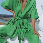 Design: Un set sofisticat format din două piese, care include o cămașă oversized cu nasturi și talie legată pentru o siluetă flatantă, asociată cu pantaloni cu talie înaltă și picioare largi. Croiala relaxată și materialul din in respirabil oferă eleganță fără efort.