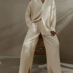 Design: Un set relaxat în două piese care include o cămașă oversized cu detalii de buzunare plisate, asociată cu pantaloni cu talie înaltă și picioare largi. Designul elegant și fără efort combină confortul cu sofisticarea modernă.