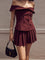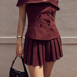 Design: Un set statement format din două piese, cu un blazer cu umeri goi structurat și o croială ajustată, asociat cu o fustă plisată fluidă. Contrastul între croiala ascuțită și plisajele moi creează un aspect sofisticat și modern.