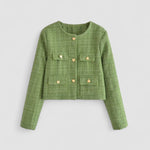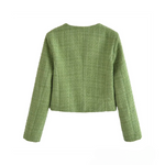 • Jachetă chic scurtă: Prezintă nasturi în formă de inimă și buzunare frontale practice.