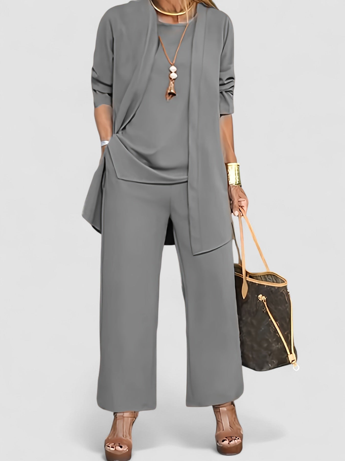 Întâlnește noua ta ținută preferată: Setul Sylvie Versastyle din trei piese. Proiectat cu grijă pentru femeia modernă, acest set coordonat oferă un echilibru perfect între eleganță și confort. Fie că mergi la birou, la brunch sau la un eveniment de weekend, Sylvie te menține stilată, confortabilă și pregătită pentru orice.