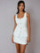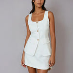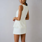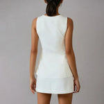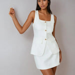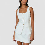 Design: Acest set prezintă un top sofisticat fără mâneci cu guler pătrat, asociat cu o fustă asortată, creând un ansamblu coeziv și stilat.